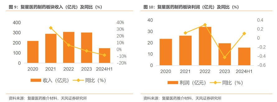 收入方面,公司制药板块2024H1实现收入146.8亿元,同比下降8.24%,剔除新冠影响后同比增长1.89%,基本保持稳定。利润方面,2023年,公司对存在减值迹象的新冠相关产品和资产进行处置及计提减值准备共计约5.69 亿元,导致2023年利润同比下降42.54%。2024H1 制药板块利润重回增长通道,2024H1实现利润15.71亿元,同比增长10.48%。