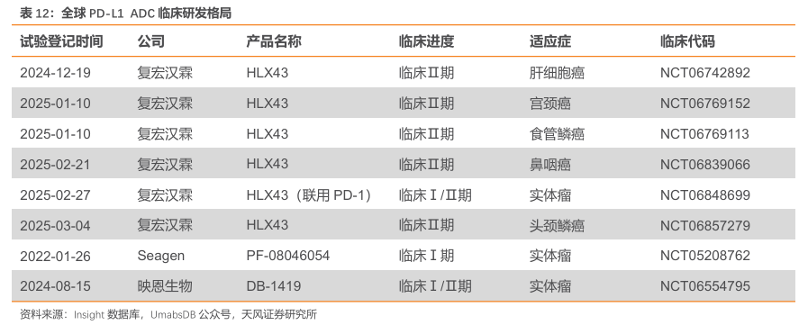 全球共3款PD-L1ADC进入临床。Seagen/辉瑞的PF-08046054于2022年1月进入临床,是全球范围内首个进入临床的PD-L1ADC。截至2025年3月19日,复宏汉霖已经同步开展6个Ⅱ期临床试验(包含Ⅰ/Ⅱ期)。此外,映恩的PD-L1/B7H3ADC于2024年8月进入临床。