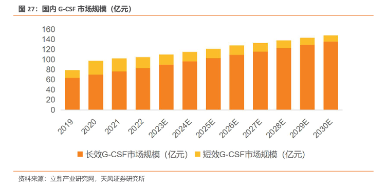 G-CSF 类药物保持快速增长,长效制剂占主导。根据弗若斯特沙利文预测,2020年,我国已上市的G-CSF类药物总收入约为97.31亿元,其中长效产品的销售额为63.29亿元,长效制剂市场份额超过70%。在我国癌症新发患者数量不断上升的背景下,长效G-CSF类药物作为癌症患者化疗后升白刚需用药,其市场规模有望进一步。长效G-CSF类药物在2025 年预计达到102.70亿元的销售规模,在2030年将达到135.37亿元,CAGR约8%。