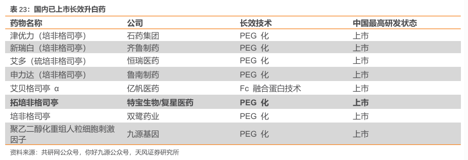 长效升白药竞争激烈。目前国内已获批8款长效升白药,包括7款PEG类长效制剂(石药百克的津优力、齐鲁制药的新瑞白、鲁南制药的申力达、双鹭药业培非格司亭、特宝生物的拓培非格司亭、恒瑞医药的艾多以及九源基因的聚乙二醇化重组人粒细胞刺激因子),以及1款Fc融合蛋白长效制剂(亿帆医药/正大天晴的艾贝格司亭α)。