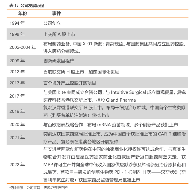 上海复星医药(集团)股份有限公司(“复星医药”,股票代码:600196.SH,02196.HK)成立于1994年,是一家植根中国、创新驱动的全球化医药健康产业集团,直接运营的业务包括制药、医疗器械、医学诊断、医疗健康服务,并通过参股国药控股覆盖到医药商业领域。