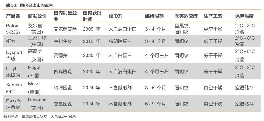 中国内地对肉毒素产品的管制严格,市场准入门槛极高。目前获批上市的肉毒素产品已有6 款,分别是衡力、保妥适、吉适、乐提葆、西马以及复星医药的RT002。