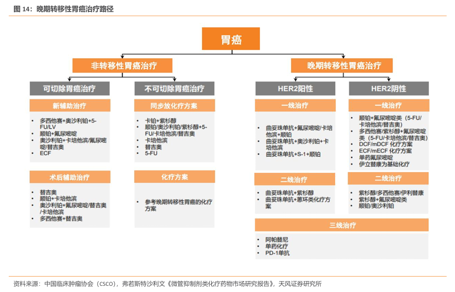 HER2 阳性胃癌占比10-15%。HER2阳性胃癌约占全部胃癌的10%-15%,不同国家的发生比例存在一定差异。对于HER2阳性患者,一线联合使用曲妥珠单抗及一线化疗药物(如氟尿嘧啶/卡培他滨及顺铂),对于靶向治疗失败的患者,在二线继续使用曲妥珠单抗+化疗(紫杉醇或蒽环类化疗方案),而三线则使用阿帕替尼、纳武利尤单抗或单一化疗。