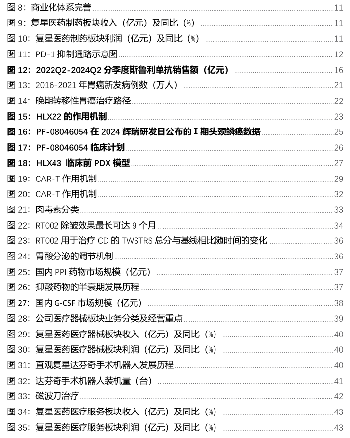 截至2024年上半年,控股医院(不包括健嘉医疗控股医院)合计床位6,578张;持有8家互联网医院牌照。公司医疗服务主要可分为大湾区医院、其他地区医院及康复学科服务。(1)公司深耕大湾区等重点区域,形成了包括佛山复星禅诚医院在内的4家医疗机构组成的大湾区区域医联体;(2)其他布局医院包括:温州老年病医院、星晨妇儿医院、安徽济民肿瘤医院、星荣整形外科医院、卓尔荟等,已形成综合医院与专科医院相结合的运营模式;(3)健嘉医疗深化康复赛道布局,深耕华东地区,推进“一城多点“模式的布局,积极推进康复医院项目的标准化复制,深化跨区域医院的精细化管理。截至2024年上半年,运营康复医疗机构11家、筹建康复医疗机构7家。此外,针对康复领域,公司致力于开发新产品和服务,以满足患者个性化需求,持续对接商保完善多元化支付与服务体系,深化产业链战略合作。