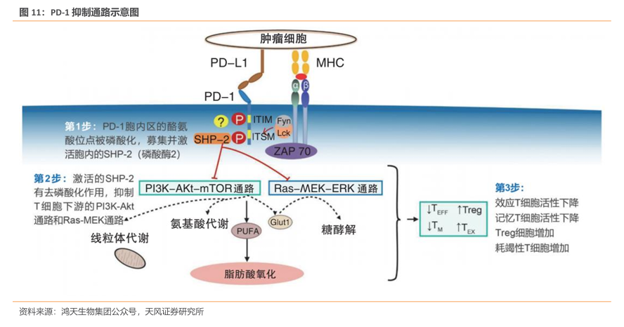 从结构上看,PD-1胞内部分由2个酪氨酸残基构成,1个是靠近N端的免疫受体酪氨酸抑制基序(ITIM),另1个是靠近C端的免疫受体酪氨酸依赖的转换基序(ITSM);其中,ITIM 上的酪氨酸可恢复细胞质段的磷酸化,从而拮抗抗原受体;而ITSM参与PD-1的负性调控。细胞外部分则是由IgV样结构域组成,该结构域能与配体结合,进而抑制T细胞的活化。当细胞表面的PD-1与配体偶联后,导致PD-1胞质区的ITSM结构域中的酪氨酸发生磷酸化,募集并激活胞内的蛋白酪氨酸磷酸酶2(SHP-2),促进下游的TCR/CD3复合体和ZAP70分子发生去磷酸化,进而抑制磷脂酰肌醇3激酶(PI3K)等的活化,抑制下游通路中AKT、ERK等的激活,从而进一步诱导CD8+T细胞和CD4+T细胞处于失活状态,抑制相关细胞因子分泌和T淋巴细胞增殖,起到免疫负调控作用。