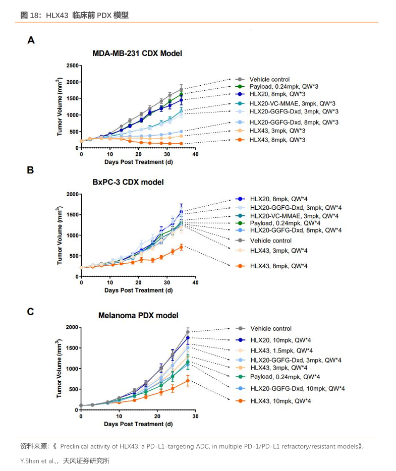 HLX43 分子设计上同样可以在肿瘤微环境中特异释放,达到扩大治疗窗的效果。2023ESMO公布的数据显示:在体内药效研究中,HLX43在多种PD-L1+CDX和PDX模型中诱导肿瘤消退,并且药物安全性良好,与对照组相比各剂量组给药小鼠体重均无明显变化:例如,在MDA-MB-231模型中每周给予动物8mg/kg的HLX43,连续治疗三周后动物的肿瘤体积显著缩小,且药物未导致小鼠体重下降。与等剂量给药的anti-PD-L1Ab-GGFG-DxdADC组相比,HLX43在所有体内模型中(包括PD-L1低表达、高度异质性和对PD-1/PD-L1抑制剂不响应的模型)展现出更优异的抗肿瘤效果。