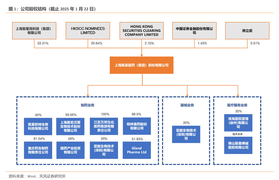 复星医药旗下子公司众多,包括制药业务复星凯瑞(持股50%)、复宏汉霖(持股59.56%)、江苏万邦(持股100%)、桂林南药(持股96.5%)、重庆药友(持股61.04%)、GlandPharma(持股51.83%)等,器械业务亚能(持股20%),医疗服务业务淮海医院(持股35%)、佛山复星禅城医院(相关实体)。