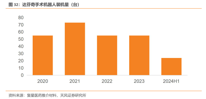 2023 年国家卫监委发布《国家卫生健康委关于发布“十四五”大型医用设备配置规划的通知》,研究制定了大型医用设备配置规划。根据规化,十四五期间(2021年到2025年)大型医用设备配置规划数中腹腔内窥镜手术系统规划总数为819台,其中“十四五”规划数559台,达芬奇手术机器人市场有望持续扩容。直观复星的达芬奇手术机器人2024年上半年装机量24台,截至2024年6月末,已为超54万名国内患者提供治疗,在全国300多家医院落户、累计装机量超过380台。