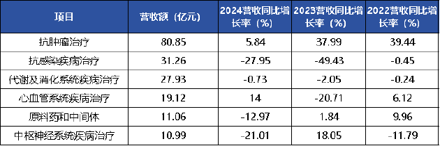 进一步拆分来看,制药业务具体包括抗肿瘤、抗感染、代谢及消化系统疾病治疗、心血管系统疾病治疗、原料药和中间体药物、中枢神经系统疾病治疗六项业务,2024年各业务营收占比分别为19.69%、7.61%、6.8%、4.66%、2.69%、2.68。