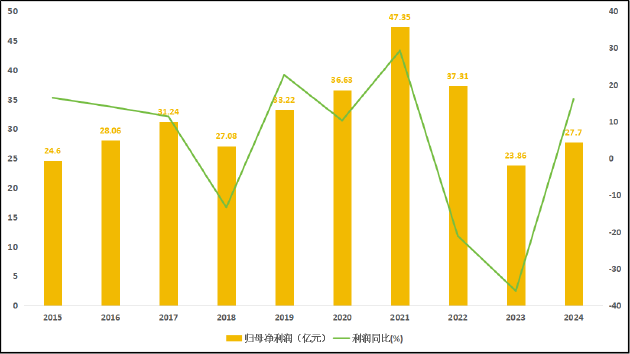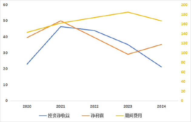 2021年-2024年,公司投资净收益分别为46.24亿元、43.78亿元、35.02亿元、21.05亿元,呈逐年下降趋势。结合利润及期间费用数据来看,过去三年公司投资收益与净利润变动方向基本一致,自2021年投资收益下滑起,公司净利润也出现两连降。