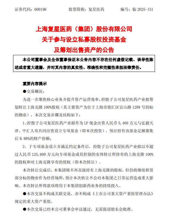 近日,复星医药公告,控股子公司复星医药产业宣布拟通过专项基金转让上海克隆100%股权及债权,交易对价不超过12.56亿元。