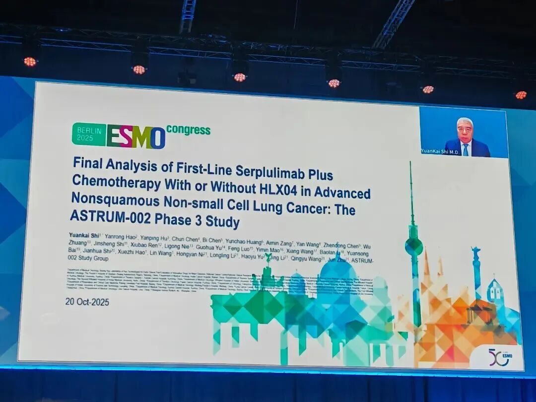 2025年10月21日,复星医药子公司复宏汉霖(2696.HK)宣布,公司自主研发的创新型抗PD-1单抗H药汉斯状?(斯鲁利单抗,欧洲商品名:Hetronifly?)肺癌和消化道肿瘤领域多项研究最新结果在2025年欧洲肿瘤内科学会年会(ESMO 2025)上发布。其中,H药汉斯状?一线治疗晚期非鳞状非小细胞肺癌的III期临床(ASTRUM-002)研究的最终分析结果入选本次大会的LBA(Late-breaking Abstract),以口头汇报形式首次正式公布总生存期(OS)数据。最终分析结果显示,斯鲁利单抗联合化疗组的中位总生存期(mOS)达到26.8个月,成功突破两年大关。
