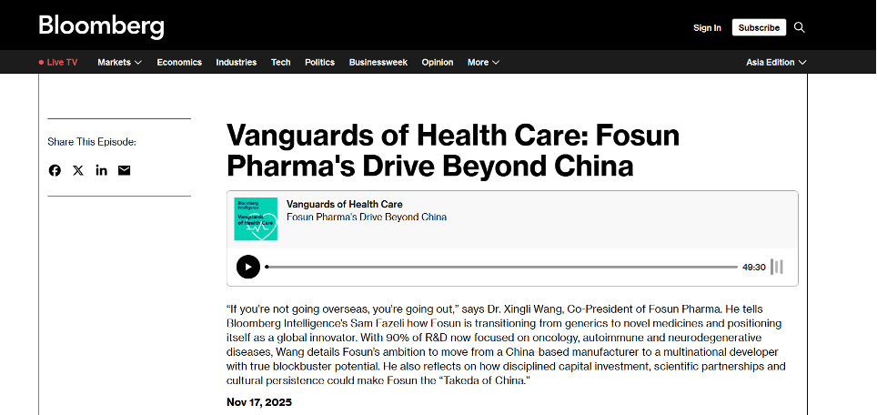 “不征四海,何创时代?” 复星医药 联席总裁、全球研发中心首席执行官王兴利博士近日在接受彭博行业研究(Bloomberg Intelligence)记者 Sam Fazeli 的采访时表示,“ 复星医药 正积极推进创新转型,并致力于为全球领先的医疗创新整合者。如今 复星医药 90%的研发资源聚焦于肿瘤、免疫炎症和神经退行性疾病。”采访中,王兴利详细阐述了 复星医药 从一家中国本土的药企向具备真正重磅产品潜力的跨国药企迈进的雄心。
