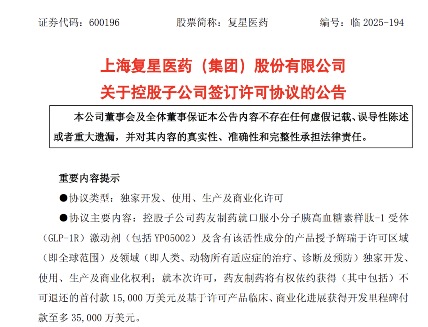而且这波BD交易的信号意义远大于金额本身,说明 复星 医药的小分子平台,开始进入全球主流药企清单。