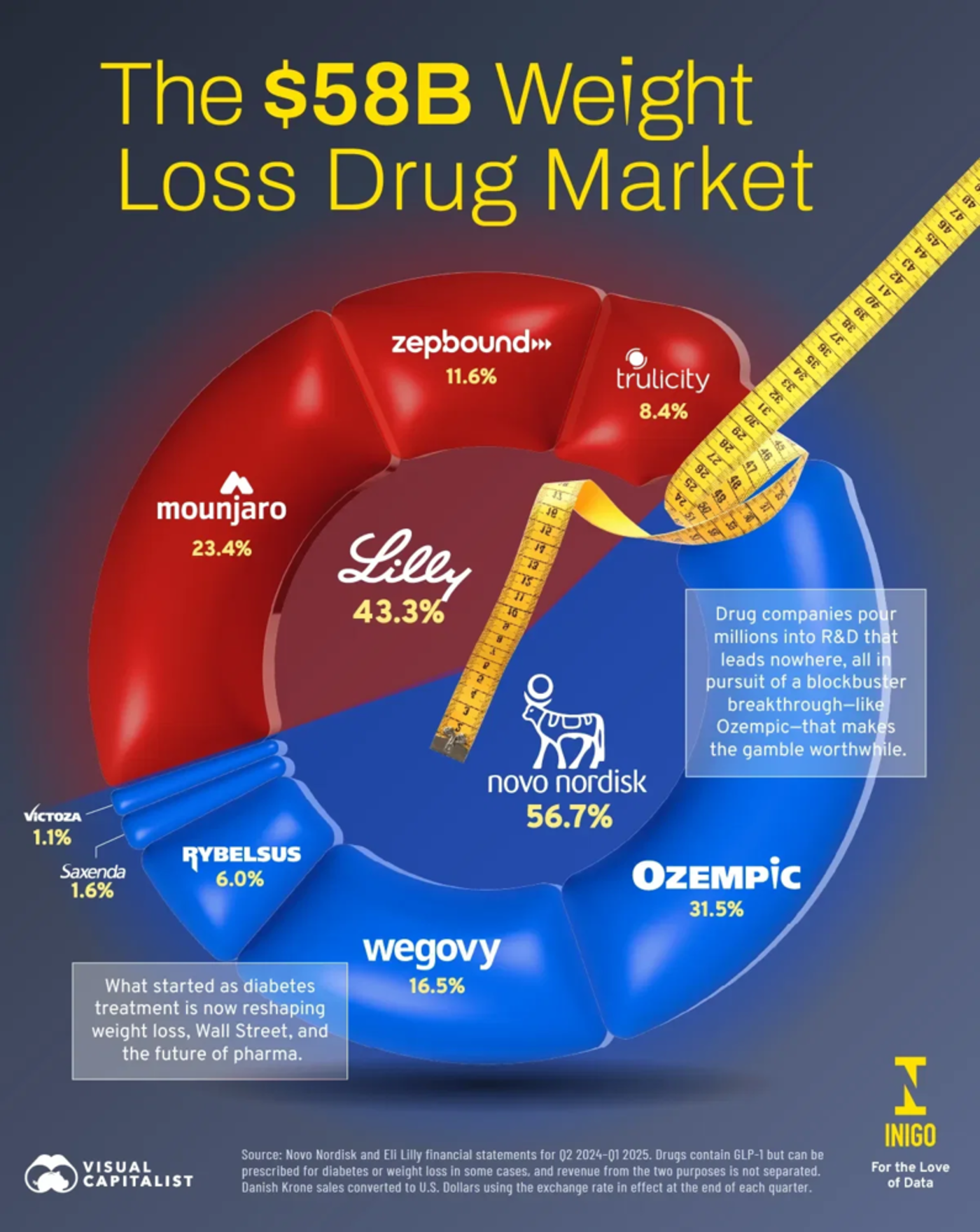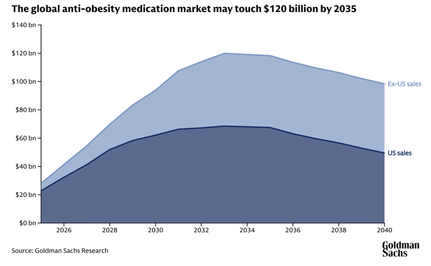 这几年GLP-1的热度一直很高,从减重到糖尿病到心血管风险管理,把礼来和诺和诺德市值打上了7000亿美金的高度。根据高盛和 摩根士丹利 的测算,2030年全球GLP-1减重药市场可能冲击600–900亿美金,甚至有机构给到1000亿以上的终局空间。