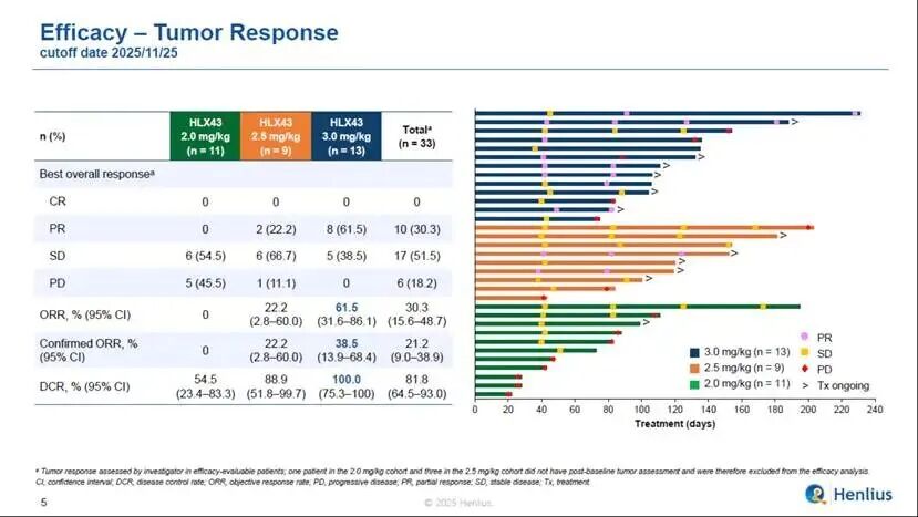 截至数据截止日期2025年11月25日,共有37名患者随机分组并接受HLX43治疗,剂量分别为2 mg/kg(n = 12)、2.5 mg/kg(n = 12)和3 mg/kg(n = 13)。大多数患者的ECOG PS评分为1(86.5%)。既往抗肿瘤治疗线数中位数为2(范围,1–4)。全部患者(100%)接受过化疗及免疫治疗,27.0%的患者接受过靶向治疗,CPS≥1患者占75.7%,中位随访时间为3.5个月。