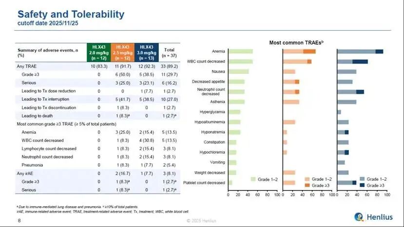 安全性方面,33例患者(89.2%)发生了治疗相关不良事件(TRAEs),其中11例患者(29.7%)报告了≥3级TRAEs,最常见的≥3级TRAEs(发病率≥5%)包括贫血(13.5%)、白细胞计数下降(13.5%)、淋巴细胞计数降低(8.1%)、中性粒细胞计数降低(8.1%)、肺炎(5.4%)等。TRAEs导致1例(2.7%)患者用药剂量减少,1例(2.7%)患者永久停药,1例患者死亡。其中,在疗效信号更为显著的3mg/kg剂量组中,HLX43安全性良好,5例患者(38.5%)报告了≥3级TRAEs,1例患者(7.7%)因TRAEs导致用药剂量减少,无患者(0%)因TRAE导致永久停药或死亡。