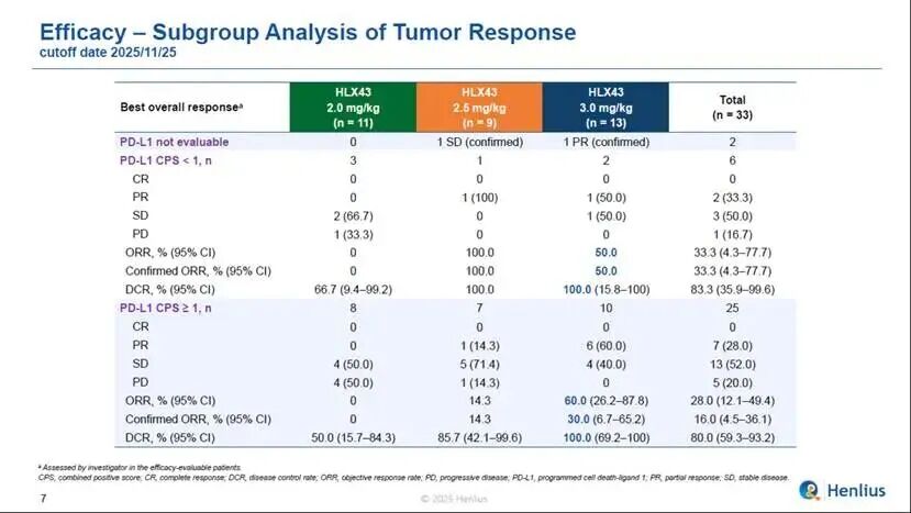 33例疗效可评估的患者中,观测到了积极信号,ORR为30.3%,DCR为81.8%。尤为值得关注的是,在3 mg/kg剂量组的13例疗效可评估的患者中,8例患者达到了部分缓解,ORR为61.5%,DCR为100.0%,确认的ORR(cORR)为38.5%;3 mg/kg剂量下,CPS≥1的PD-L1阳性患者(n = 10)中,ORR为60.0%,DCR为100%;CPS<1的PD-L1阴性患者(n=2)ORR为50%,DCR为100%,初步提示HLX43疗效不限患者PD-L1表达限制,但仍待后续更大样本量的随机对照研究进一步验证。