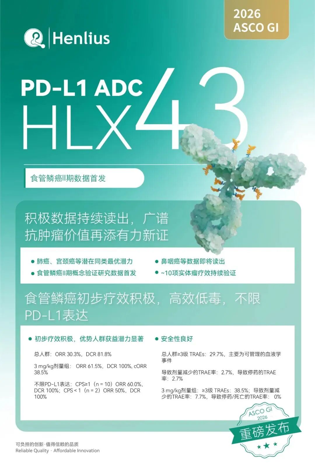 HLX43是一款潜在同类最优及疾病领域最优的广谱抗肿瘤ADC,兼具免疫检查点阻断与载荷细胞毒性的双重作用机制。临床前研究显示,HLX43在PD-1/PD-L1单抗耐药的非小细胞肺癌、宫颈癌、食管鳞癌等多个瘤种中展现出治疗潜力,且耐受性良好。其I期临床数据于2025美国临床肿瘤学会(ASCO)年会及2025 世界肺癌大会(WCLC)上先后发布,在NSCLC等实体瘤中展现出“高效、低毒”的显著疗效,尤其在NSCLC的治疗上,HLX43展现了全人群覆盖的潜力。