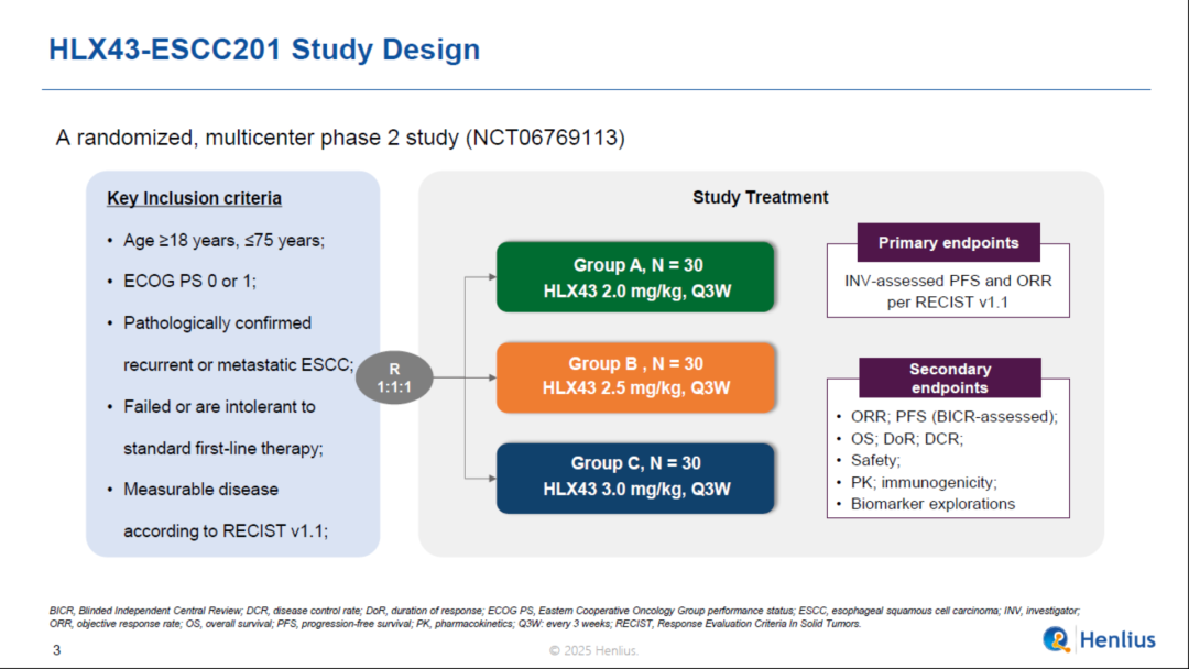 本次发布基于一项评估 HLX43 在复发/转移性食管鳞癌中有效性和安全性的多中心、随机的II 期临床研究。研究入组了经组织学或细胞学确诊的复发/转移性ESCC的患者,接受一线化免治疗后进展或不耐受,并按1:1:1的比例随机分组,接受每3周一次静脉注射2 mg/kg、2.5 mg/kg或3 mg/kg 的HLX43。主要终点为研究者根据RECIST v1.1评估的客观缓解率(ORR)和无进展生存期。次要终点包括其他有效性终点、安全性、药代动力学、免疫原性和生物标志物探索。