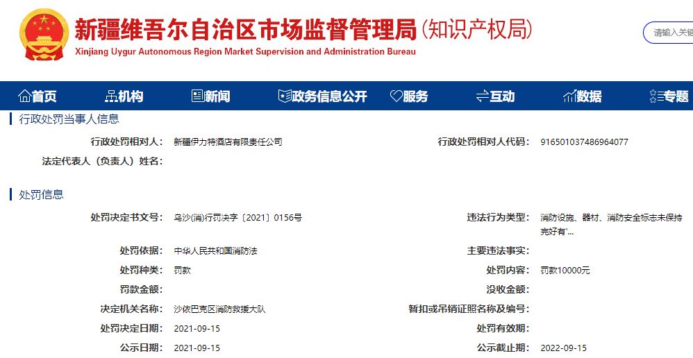 中国经济网北京9月18日讯 9月15日,新疆维吾尔自治区市场监督管理局网站公布的处罚决定书(乌沙(消)行罚决字〔2021〕0156号)显示,新疆伊力特酒店有限责任公司存在消防设施、器材、消防安全标志未保持完好有效的违法行为,沙依巴克区消防救援大队依据《中华人民共和国消防法》对该公司罚款10000元。