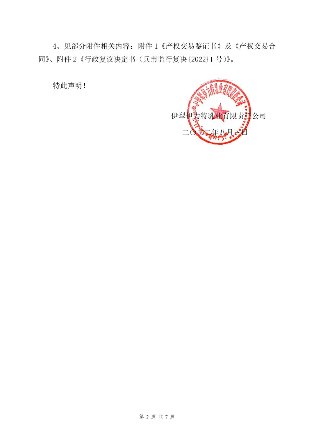 伊力特乳业同时公开了新疆生产建设兵团市场监督管理局发布的《行政复议决定书(兵市监行复决〔2022〕1号)》,显示已裁定伊力特乳业名称的使用不构成对新疆伊力特实业股份有限公司的任何侵权行为。