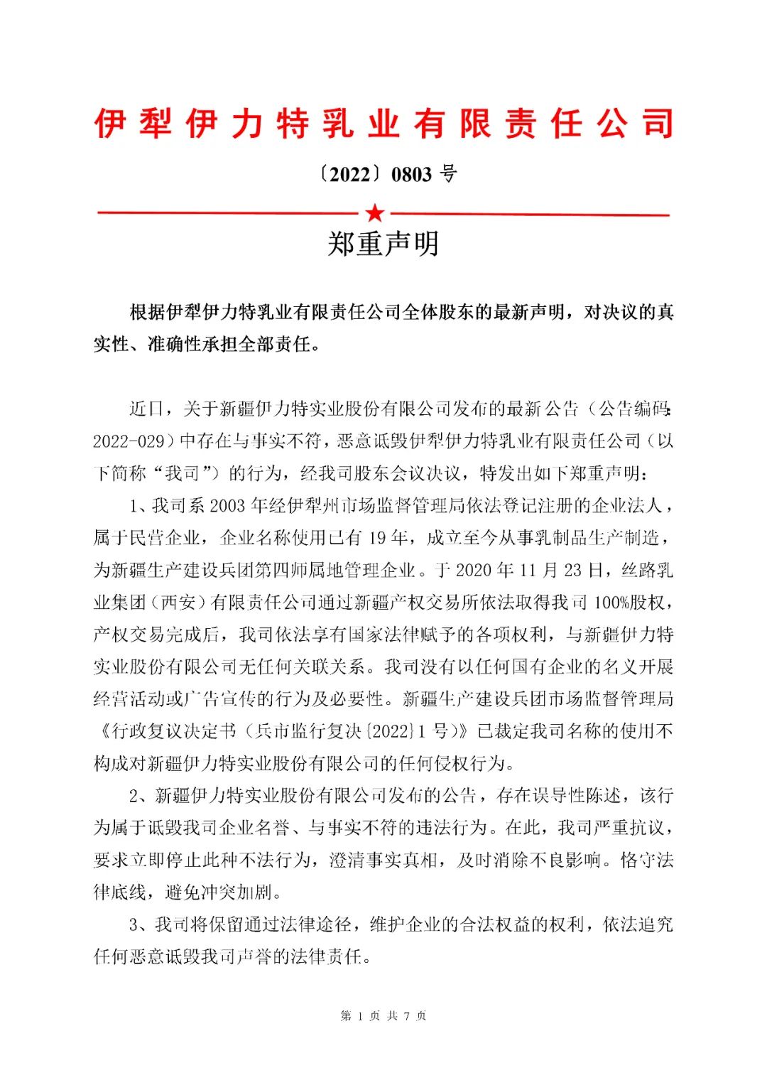 对此,日前伊犁伊力特乳业有限责任公司(以下简称“伊力特乳业”)也以书面声明的方式进行了回应。
