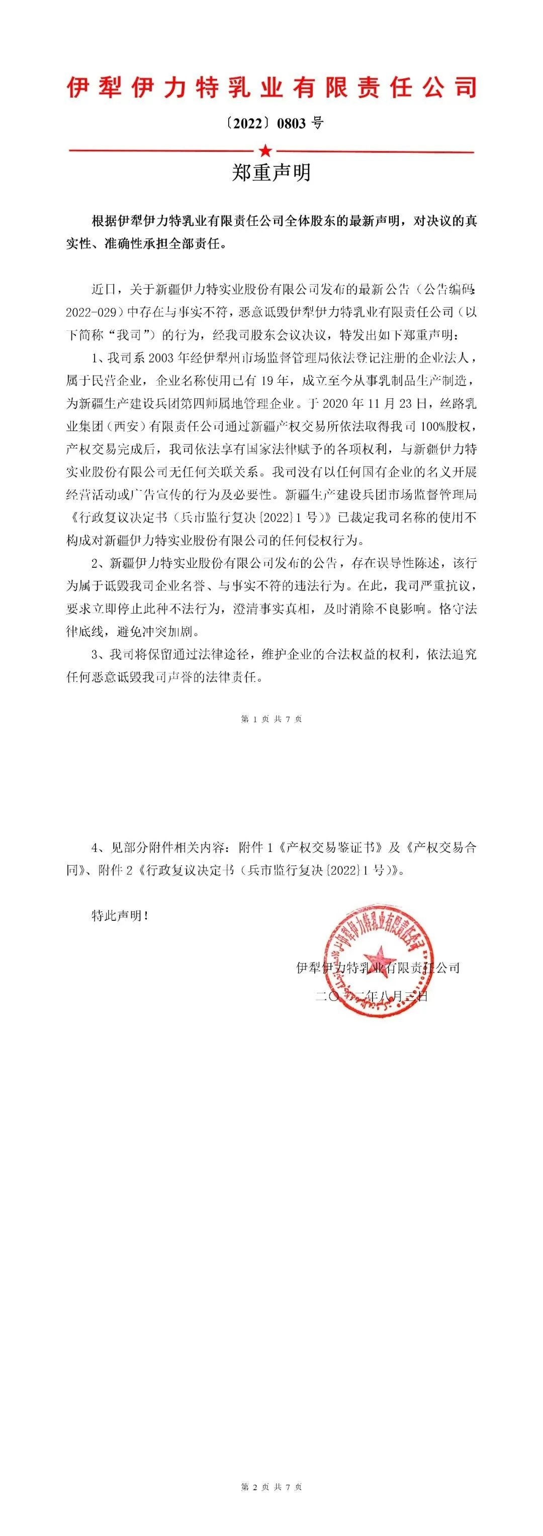 据了解,伊力特乳业前身为伊犁州寨口乳品厂,创建于1958年,是新中国第一次工业大发展背景下,新疆建成的第一家奶粉厂。面对伊力特实业的突然发难,伊力特乳业于8月4日对外发布公告,称伊力特实业公告与事实不符,将通过法律途径维护自身合法权益。