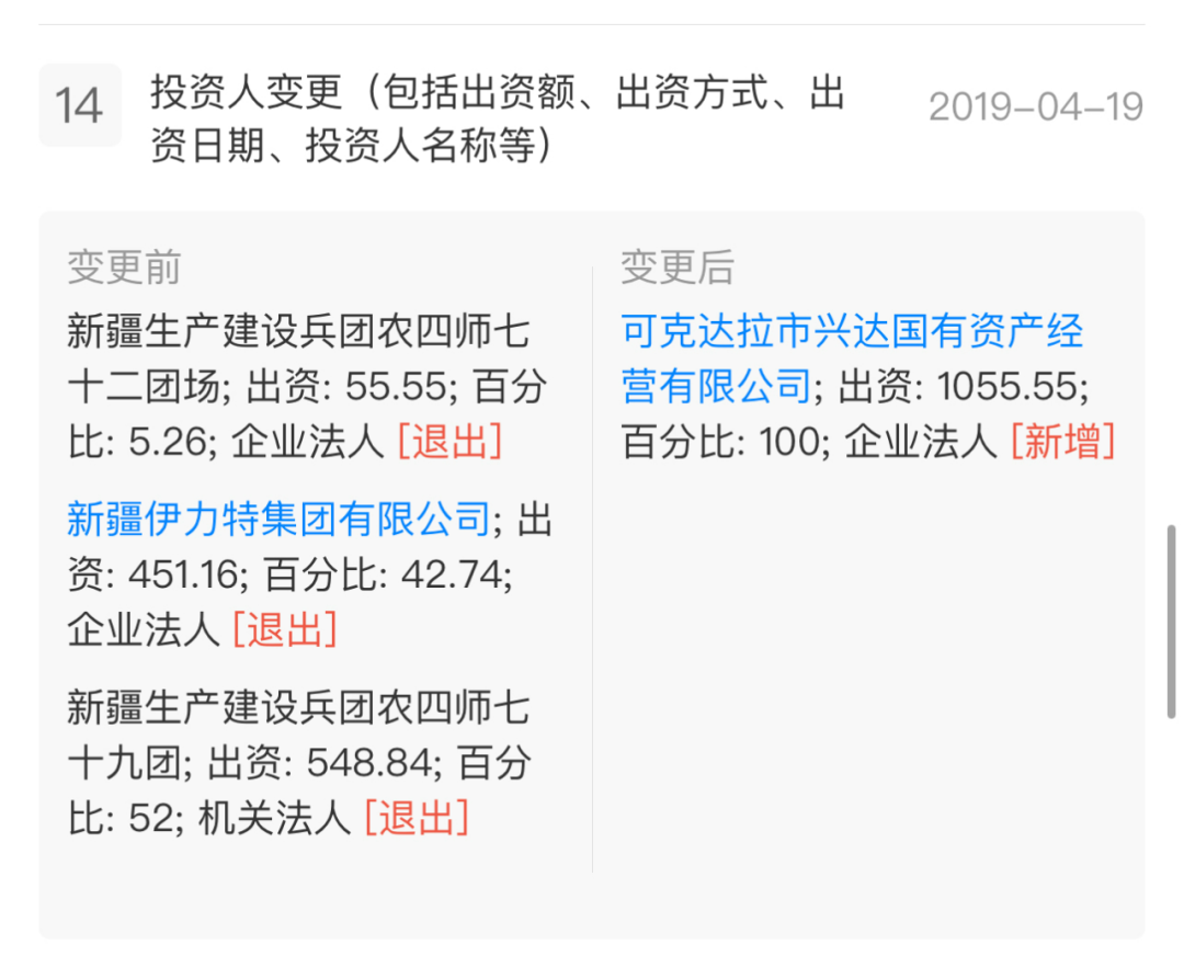 数据显示,2019年之前,伊力特乳业由伊力特集团、新疆生产建设兵团农四师七十九团、新疆生产建设兵团农四师七十二团场三方持股,伊力特集团占股42.74%;2019年,伊力特集团将持有的股权无偿划转至可克达拉市兴达国有资产经营有限公司,可克达拉市兴达国有资产经营有限公司100%控股伊力特乳业。因此在当时,伊力特乳业确实是国有企业。