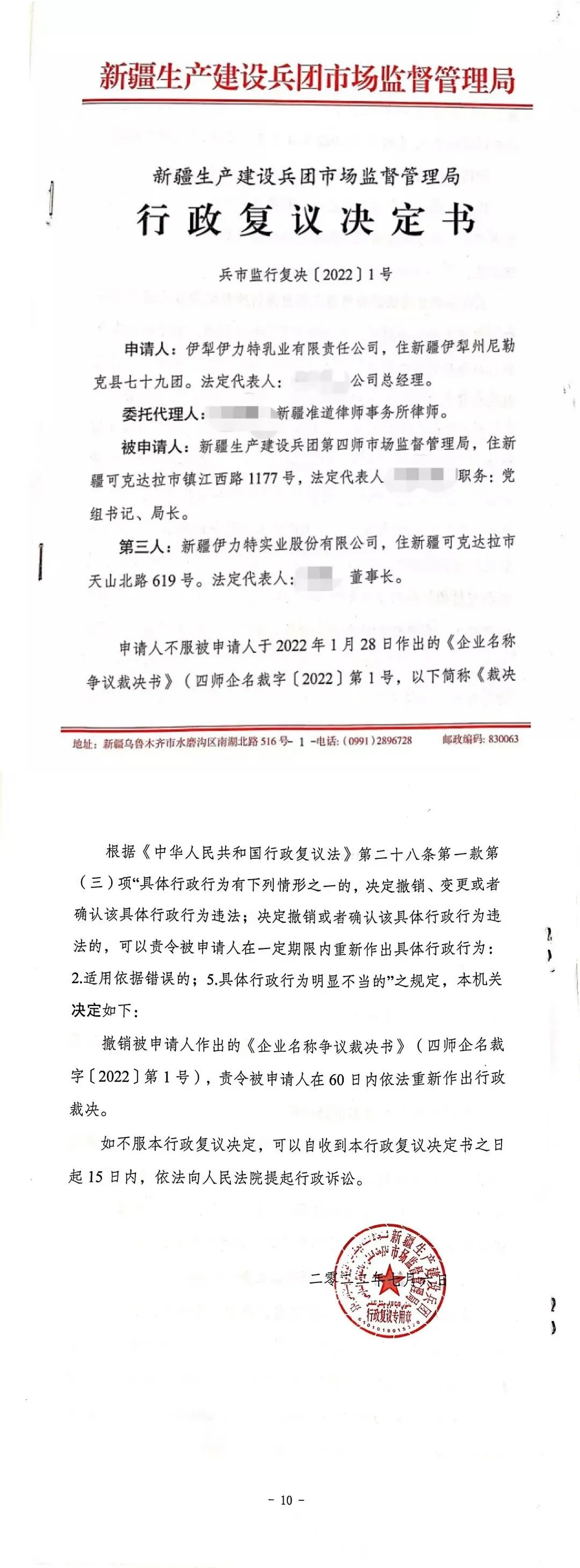 7月6日,新疆生产建设兵团市场监督管理局发布《行政复议决定书》,以“程序明显违法”、“无事实和法律依据”、“伊力特实业存在颠倒事实的陈述”三条理由,支持伊力特乳业的行政复议申请,撤销新疆生产建设兵团第四师市场监督管理局要求更名的《企业名称争议裁决书》。