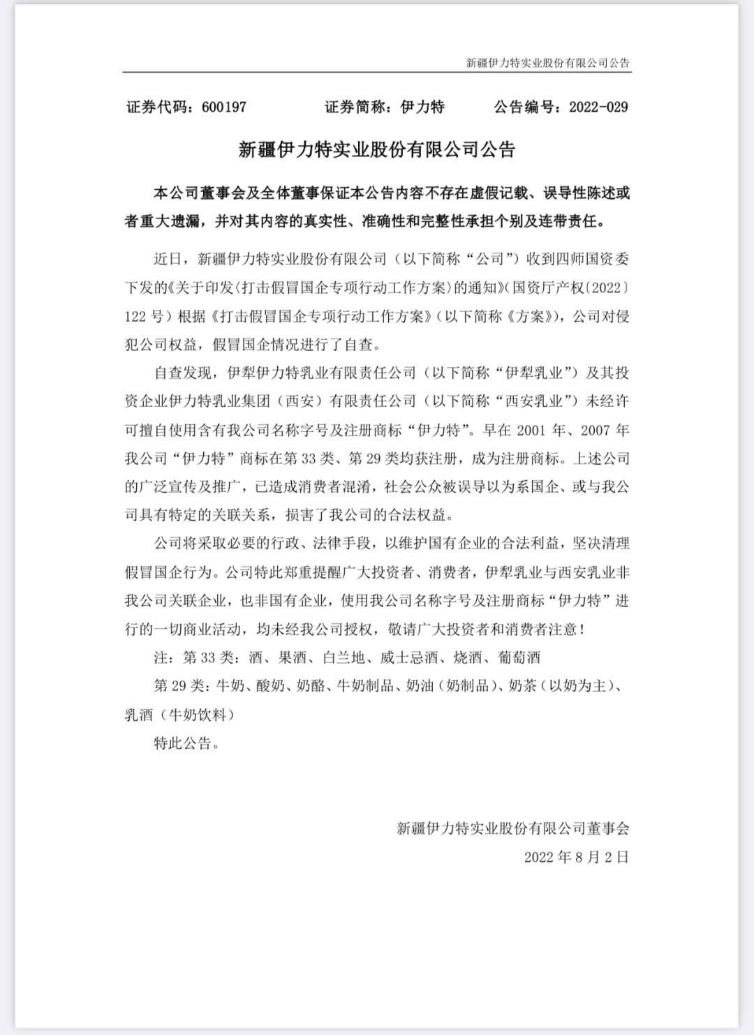 8月2日,新疆最大的白酒上市公司,新疆伊力特实业股份有限公司(以下称“伊力特实业”)对外发布公告,称伊犁伊力特乳业有限责任公司(以下称“伊力特乳业”)未经许可擅自使用含有其公司名称字号及注册商标“伊力特”,伊力特实业将采取行政、法律手段维护自身合法权益。