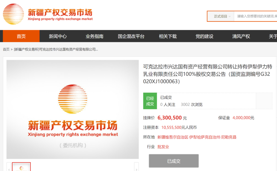 2019年,停产的伊力特乳业负债累累,已经成为国营企业中的不良资产。为了做最后抢救,由可克达拉市兴达国有资产经营有限公司(以下称“兴达公司”)接手了伊力特乳业100%股权。而后,兴达公司将伊力特乳业在新疆产权交易所对外挂牌转让,以期出现“白衣骑士”。但是一家负债累累的停产工厂,对于外界来讲实在难有吸引力,自在产权交易所挂牌之后,无人问津,接连两次流拍。