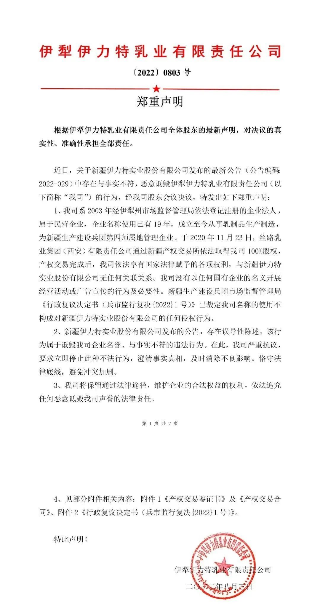 伊力特实业发布公告次日,伊力特乳业执行董事刘江公开表示“已经定性、没有侵权”。