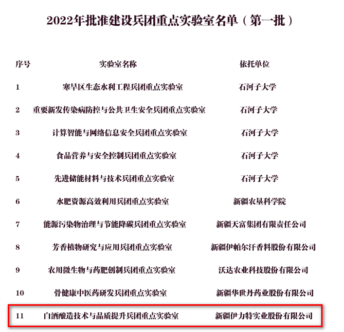 为加强兵团创新平台建设,提升科技创新能力,兵团批准建设寒旱区生态水利工程、白酒酿造技术与品质提升等13个重点实验室。伊力特白酒酿造技术与品质提升兵团重点实验室上榜。