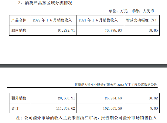 从公司营收看,2018年2021年,伊力特新疆地区的收入为14.93亿元、17.03亿元、12.03亿元、14.16亿元,而新疆以外地区的收入为5.48亿元、5.73亿元、5.90亿元、5.00亿元。整体业绩出现一定程度的下滑。2022年上半年,疆外市场销售收入更是下降了 18.32%。