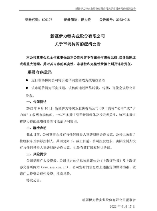对此,在投资者关系互动平台上,不少投资者咨询战投一事。2022年6月,伊力特正面回应市场传闻称,一些不实报道引发新闻媒体及投资者关注,该不实报道称伊力特的战略投资者可能是华润集团。截至目前,公司董事会没有与任何投资人签署战略合作协议,公司也函询了控股股东及实际控制人,其回复如下:截至目前,公司控股股东、实际控制人没有与任何投资人签署战略合作协议、也没有签订股权转让协议。