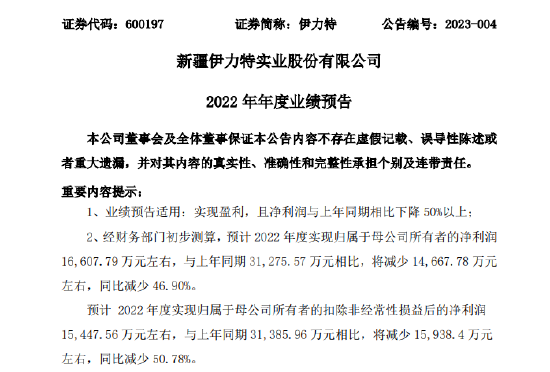 1月30日晚,新疆白酒上市企业伊力特发布业绩预告称,经财务部门初步测算,预计实现归属于母公司所有者的净利润1.66亿元左右,与上年同期的3.13亿元相比,预计减少1.47亿元左右,同比减少46.90%;扣非净利润为1.55亿元左右,与上年同期的3.14亿元相比,预计减少1.59亿元左右,同比减少50.78%。