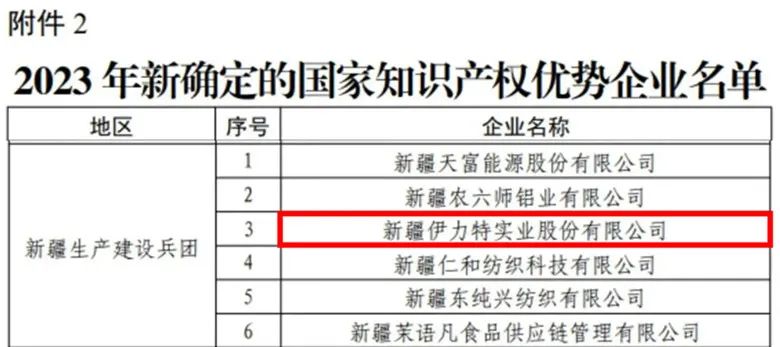近日,国家知识产权局公布了“2023年知识产权优势企业和示范企业”名单,新疆伊力特实业股份有限公司获得“2023年度国家知识产权优势企业”称号。
