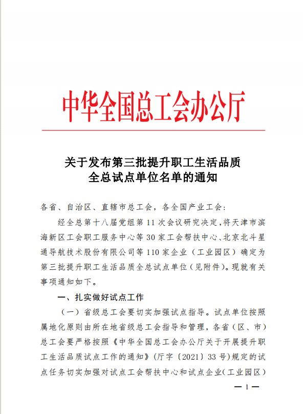 近日,全国总工会发布《关于发布第三批提升职工生活品质全总试点单位名单的通知》,30家工会帮扶中心、110家企业(工业园区)确定为第三批提升职工生活品质全总试点单位,新疆伊力特实业股份有限公司榜上有名。