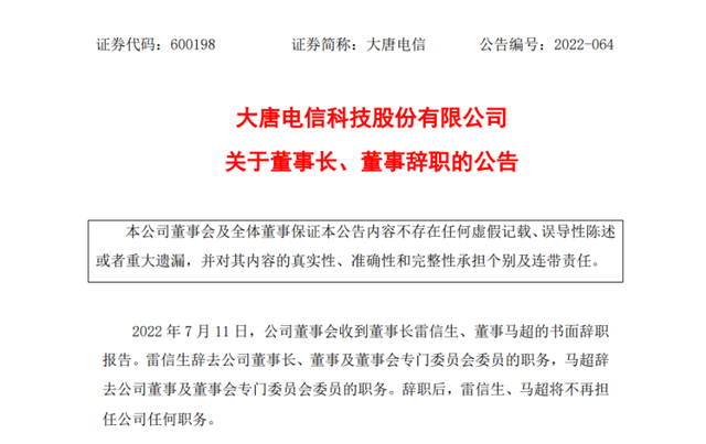 7月11日,大唐电信董事会收到董事长雷信生、董事马超的书面辞职报告。雷信生辞去公司董事长、董事及董事会专门委员会委员的职务,马超辞去公司董事及董事会专门委员会委员的职务。辞职后,雷信生、马超将不再担任大唐电信任何职务。