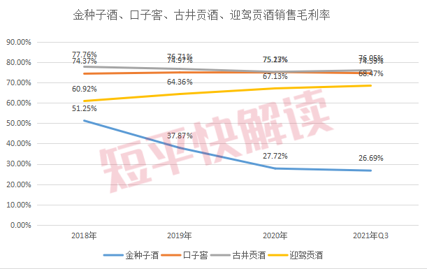 对比来看,口子窖、古井贡酒、迎驾贡酒的销售毛利率较为稳定,其中迎驾贡酒的毛利率从60.92%增加至68.47%,累计增长7.55%。金种子酒的销售毛利率在四家企业中垫底。