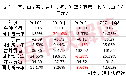 从扣非净利润来看,2018年至2021年前三季度,金种子酒累计亏损金额为4.87亿元,同期的古井贡酒、口子窖、迎驾贡酒分别盈利72.04亿元、54.69亿元、34亿元。