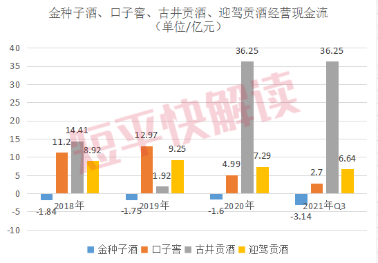 对比来看,同期口子窖、古井贡酒、迎驾贡酒的经营现金流均为净流入状态,其中口子窖合计流入31.86亿元、古井贡酒净流入88.83亿元、迎驾贡酒净流入32.1亿元。