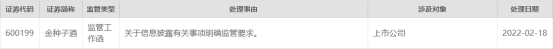 中国经济网北京2月18日讯上交所网站今日下发对金种子酒(600199.SH)的监管工作函,处理事由为关于信息披露有关事项明确监管要求,涉及对象为上市公司。