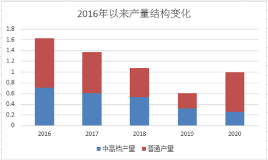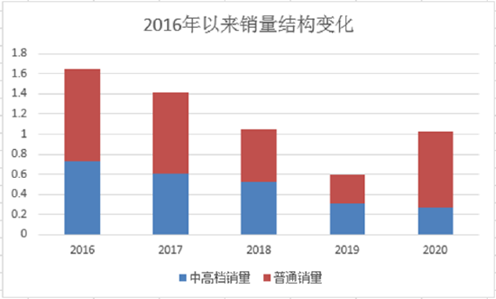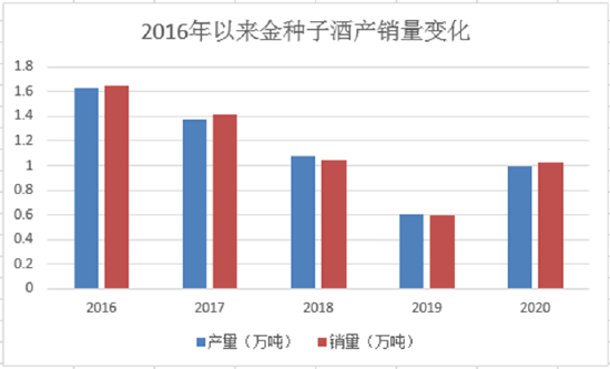 从2013年起金种子酒的白酒业务就进入了一个漫长的萎缩通道!从2013年以来,其营收只有2018年及2020年两年正增长。销量从2016年以来一路下滑,2019年产销量仅为2016年的40%。2020年产量与销量出现拐点,但是从结构来看,贡献增长的是普通白酒,中高档酒产量继续萎缩19%,销量萎缩12%。