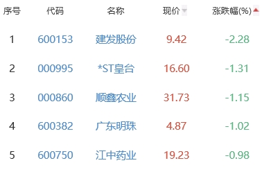 建发股份、*ST皇台、顺鑫农业、广东明珠、江中药业位列涨幅榜后五位,涨幅分别为-2.28%、-1.31%、-1.15%、-1.02%、-0.98%。