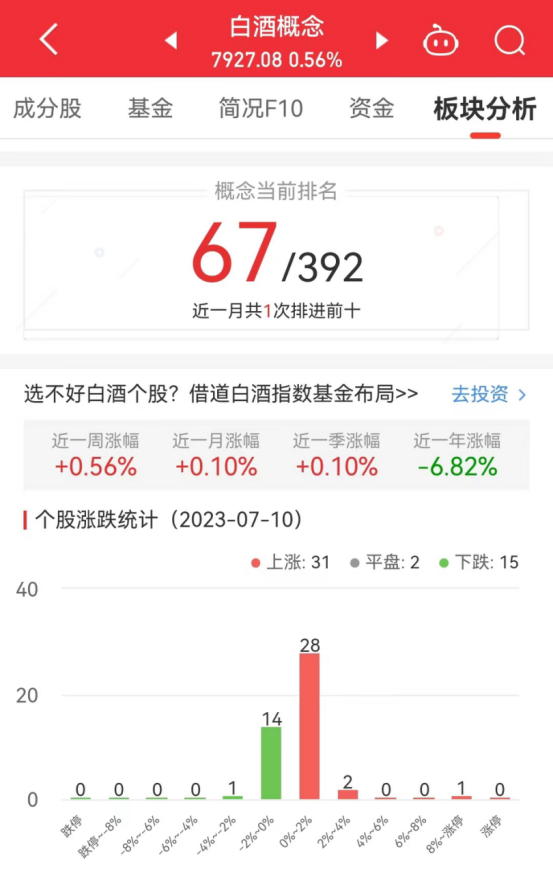 数据显示,截至今日,白酒概念板块近一周涨幅0.56%,近一月涨幅0.10%,近一季涨幅0.10%。