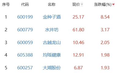 其中,金种子酒、水井坊、古越龙山、均瑶健康、大湖股份位列板块涨幅前五位,涨幅分别为8.54%、3.17%、2.05%、1.98%、1.93%。