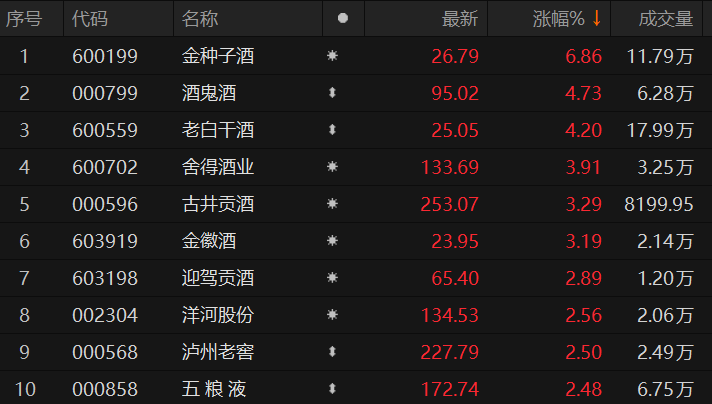 7月21日,白酒股走强,截至10:12,金种子酒涨近7%,酒鬼酒、老白干酒、舍得酒业、古井贡酒等涨超3%,贵州茅台涨近2%。