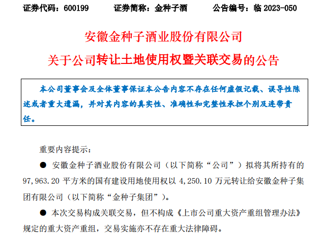 金种子酒表示,公司本次拟将持有的土地使用权转让给金种子集团,有利于提高上市公司资产质量,理顺产权关系,减少关联交易,规范公司治理,解决房、地产权分离等历史遗留问题。